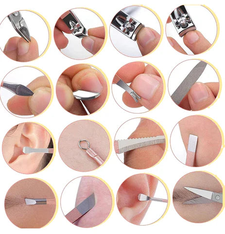 Incluye: Cortaúñas, lima de uñas, empujador de cutículas, y mucho más.
